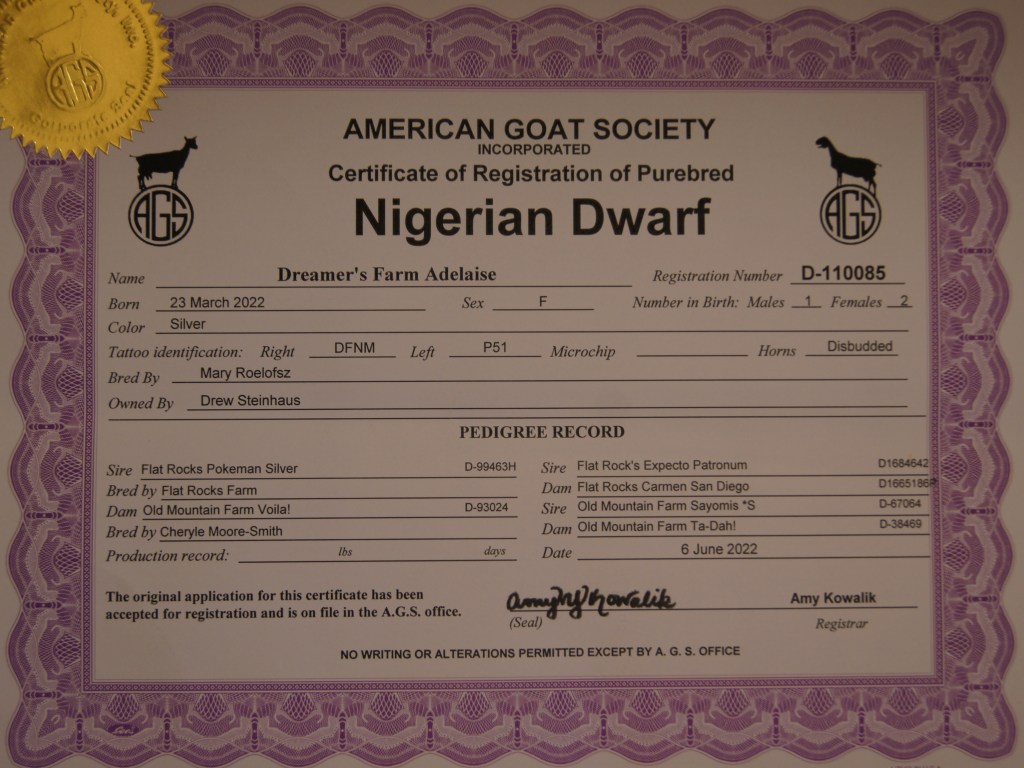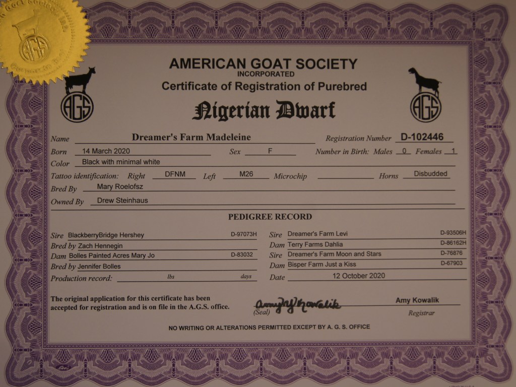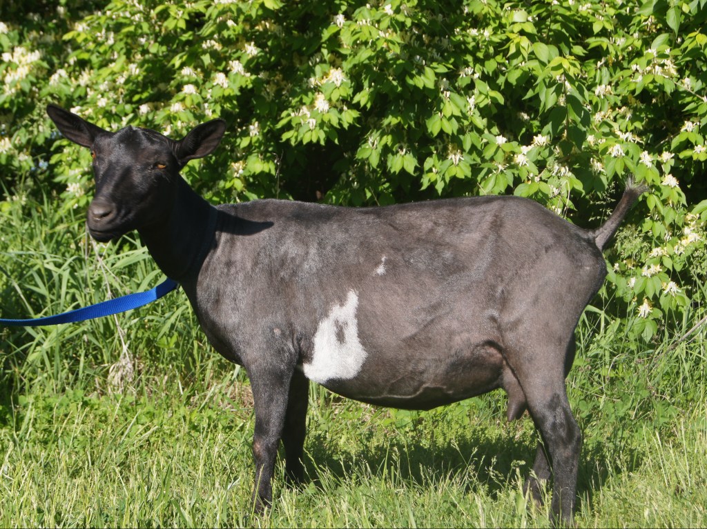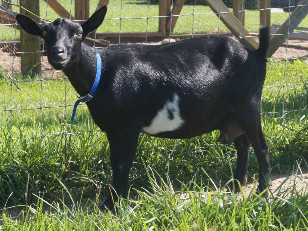 Madeleine is clearly the herd queen. Having been the first female we bought, she dominates our small herd to this day. She is an awesome milker, giving over 1 quart of sweet milk per day! She has a well-defined udder and a solid body structure. Her kids have always been breathtakingly adorable and quite robust, even as newborns! Madeleine is black with minimal white, has brown eyes, and is disbudded.