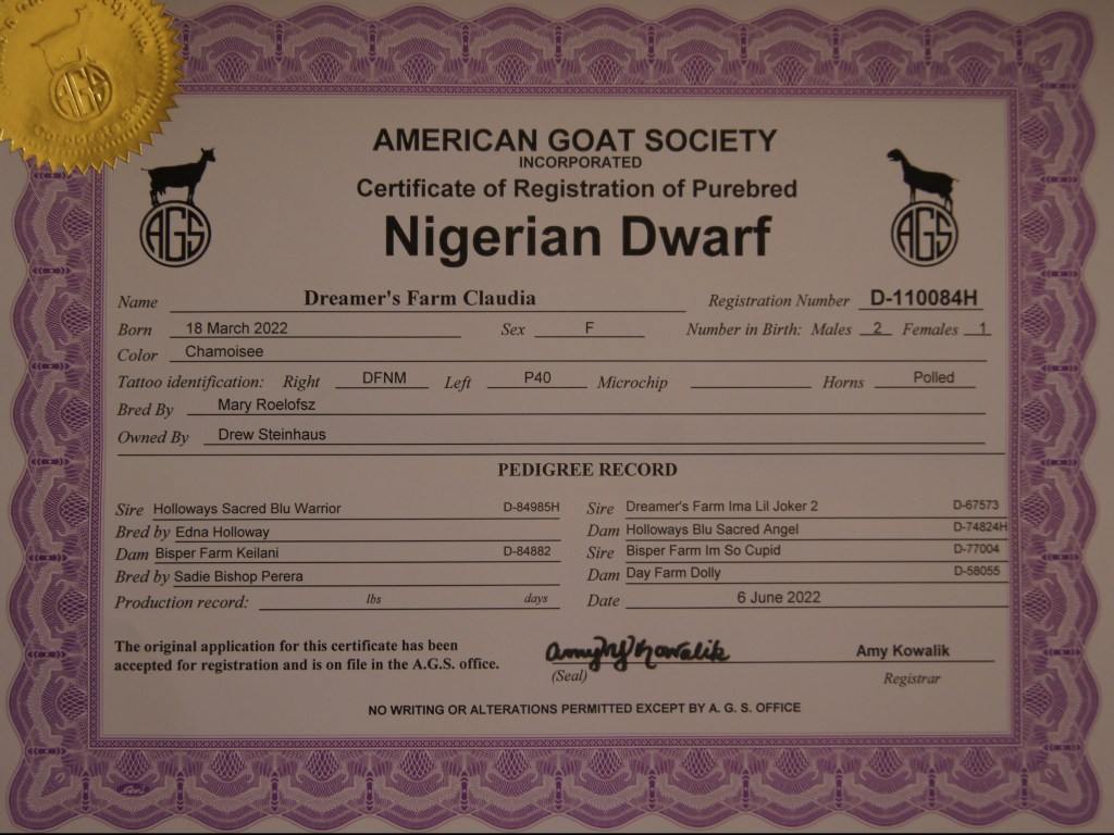 Claudia is has a perfect dairy goat appearance. Her body is long and slender, yet perfectly proportional. Her dam had an exceptionally well formed udder and produced an abundance of milk! Claudia is chamoisee with a rich red coat, black markings, and white spots. She has blue eyes and is polled.